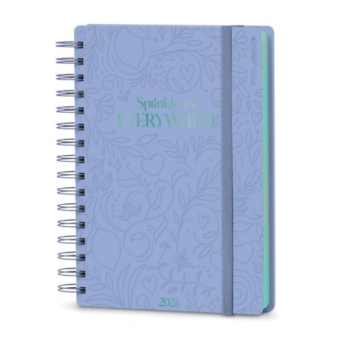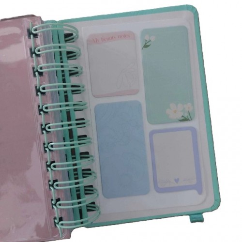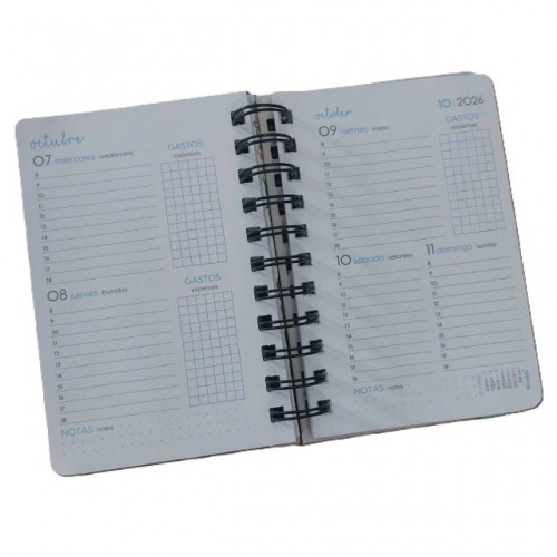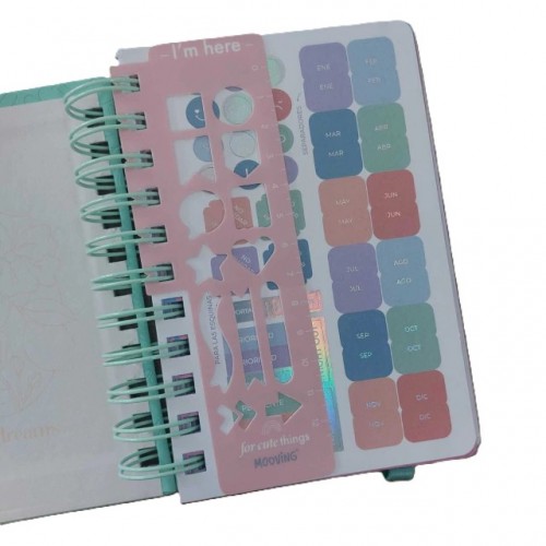 Hoja de datos personales, calendario, objetivos, plan de gastos anual/mensual, notas, sobre plastico, regla con stencils, notas adhesivas, cinta señaladora y