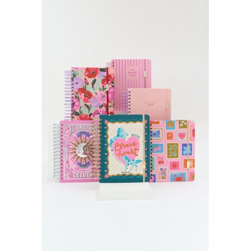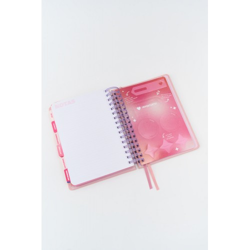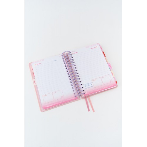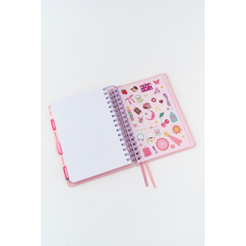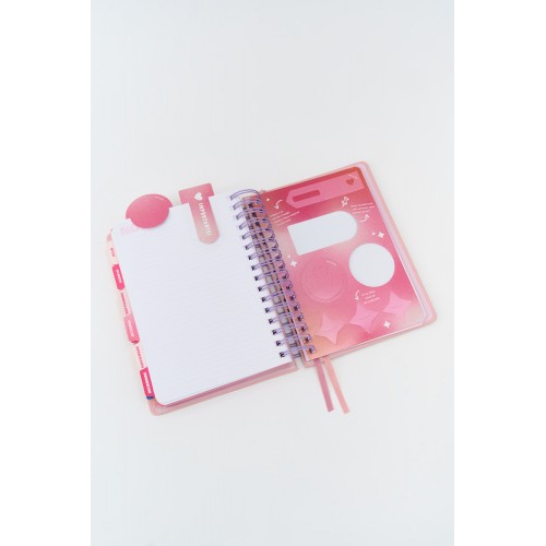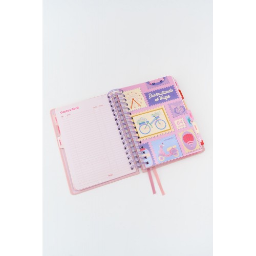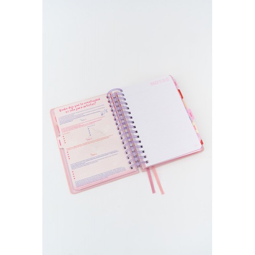 Ejercicios a lo largo de toda la agenda. Planner anual y mensual.12 separadores. Planilla de gastos, notas. Hojas para troquelar con regla y 2 clips . Sobre laminado. 3 hojas de stickers. Elastico, cinta seña