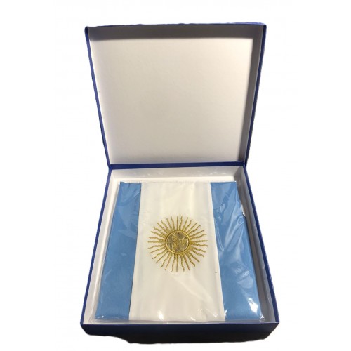 Bandera confeccionada en tela gross, sintetico, con costuras y doble sol bordado. Reglamentario en hilo dorado y cintas dobles para sujeción.