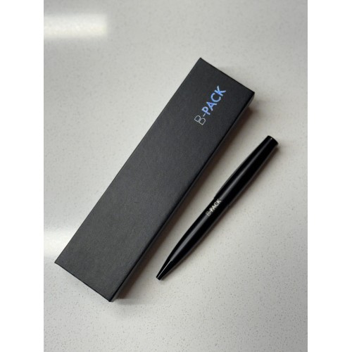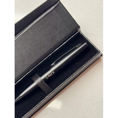 Bolígrafo con tapa , tinta azul y cuerpo metálico. Cada unidad viene en un estuche de cartón rígido con logo en hot stamping.
