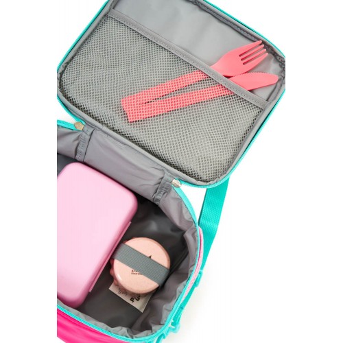 Tiene una dimension de 23x20x12 cm. Apertura 180ø. Dos correas cortas de mano. Correa de hombro ajustable y desmontable. Cinta trasera deslizable para sistema trolley. Interior impermeable y aislante, con elástico para botella y bolsillo de red.