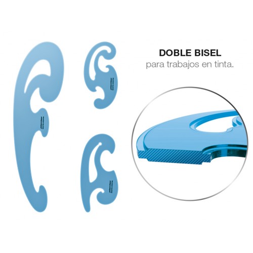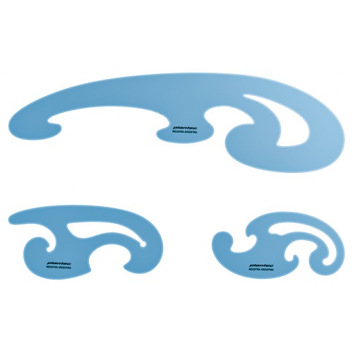 Set de tres pistoletes inyectados en acrilo-nitrilo. Curvilineas universales que permiten el dibujo de infinidad de curvas y elipses con el uso indistinto de lapiz o tinta por su doble bisel perimetral en todas las piezas.