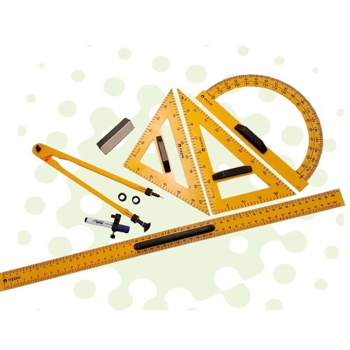 Incluye: 2 Escuadras,45ø y 60ø, 1 transportador, 1 compás, 1 borrador con felpa y regla.