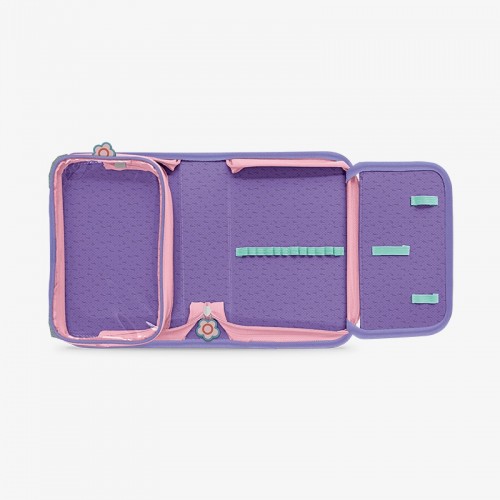 Interior: 1 amplio compartimento transparente con cierre para colocar elementos sueltos, 24 elásticos para acomodar lápices y 3 elásticos más anchos