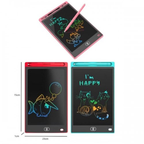 Pizarra LCD de 8.5. Funciona a pilas (incluidas), permite dibujar y escribir con su lapiz incorporado, es liviana y reutilizable.