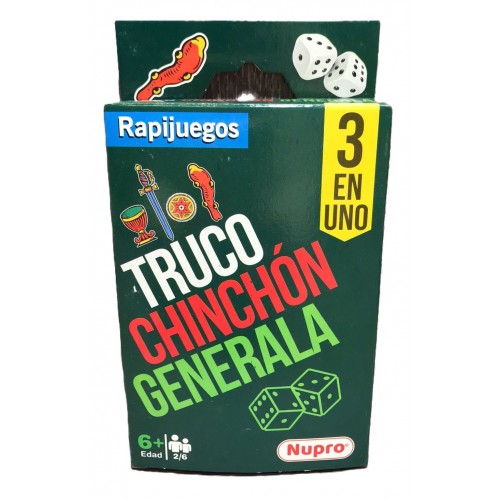 Contenido: 2 mazos de cartas españolas y 5 dados de generala.